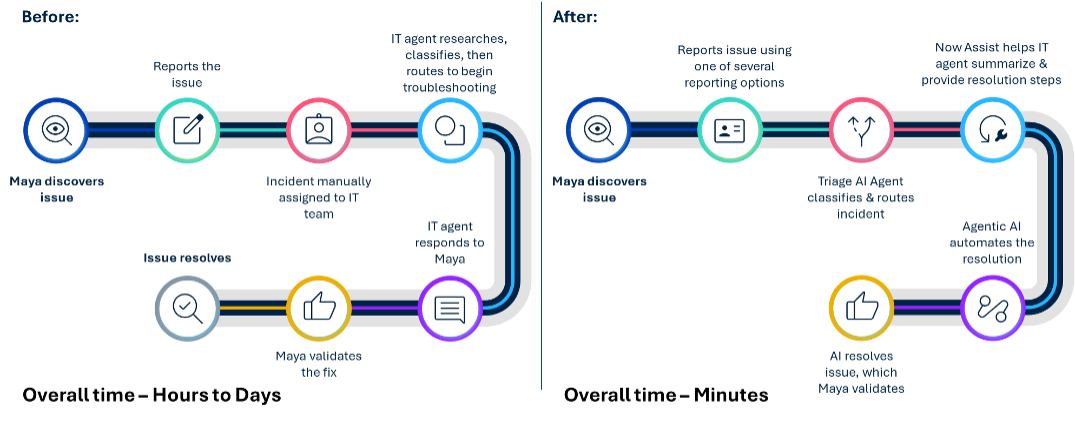 Although agentic AI can be applied to many domains, IT service operations, the intersection of IT Service Management (ITSM) and IT Operations Management (ITOM) functions, is one where AI can have a transformational impact. ServiceNow has developed its solutions to take advantage of these benefits, such as improving efficiency, reducing manual workloads, and leveraging data-driven insights while improving customer experience. ServiceNow uses agentic AI to automate ITSM and ITOM, using such agents to triage and resolve incidents faster, increase productivity and accuracy, and save time. ServiceNow refers to this capability as Autonomous Service Operations.