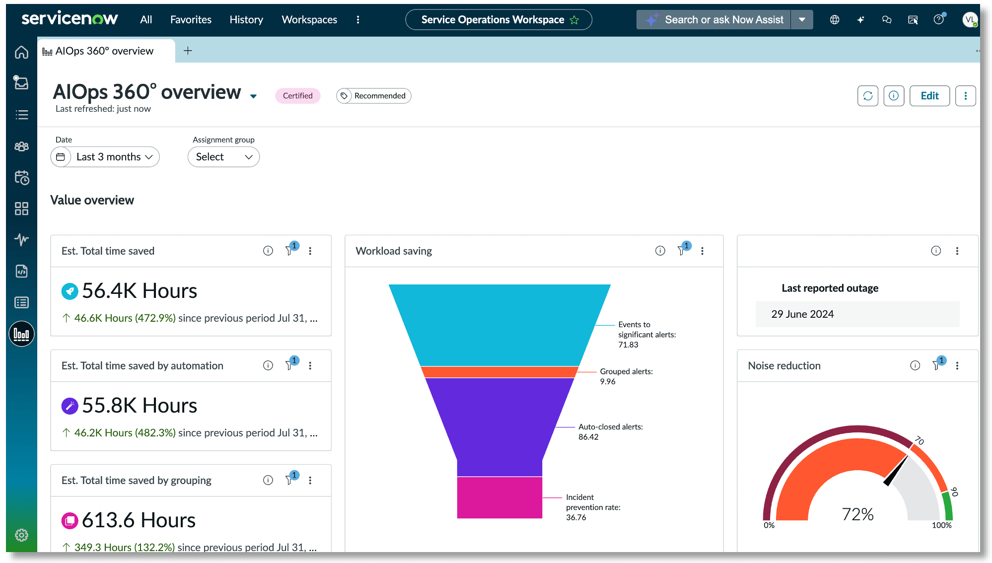 Omdia validated that ServiceNow can help organizations increase service resiliency, support business agility, and continue to respond to alerts and tickets with speed and accuracy. ServiceNow’s service-focused CMDB integrates with monitoring tools throughout the environment to give IT operators a clear view of root causes along with the context necessary to plan remediations. The AIOps 360 Overview provides a clear picture of how ServiceNow has helped organizations save time, reduce noise, and resolve incidents, showing a clear ROI from using ServiceNow’s AIOps capabilities.