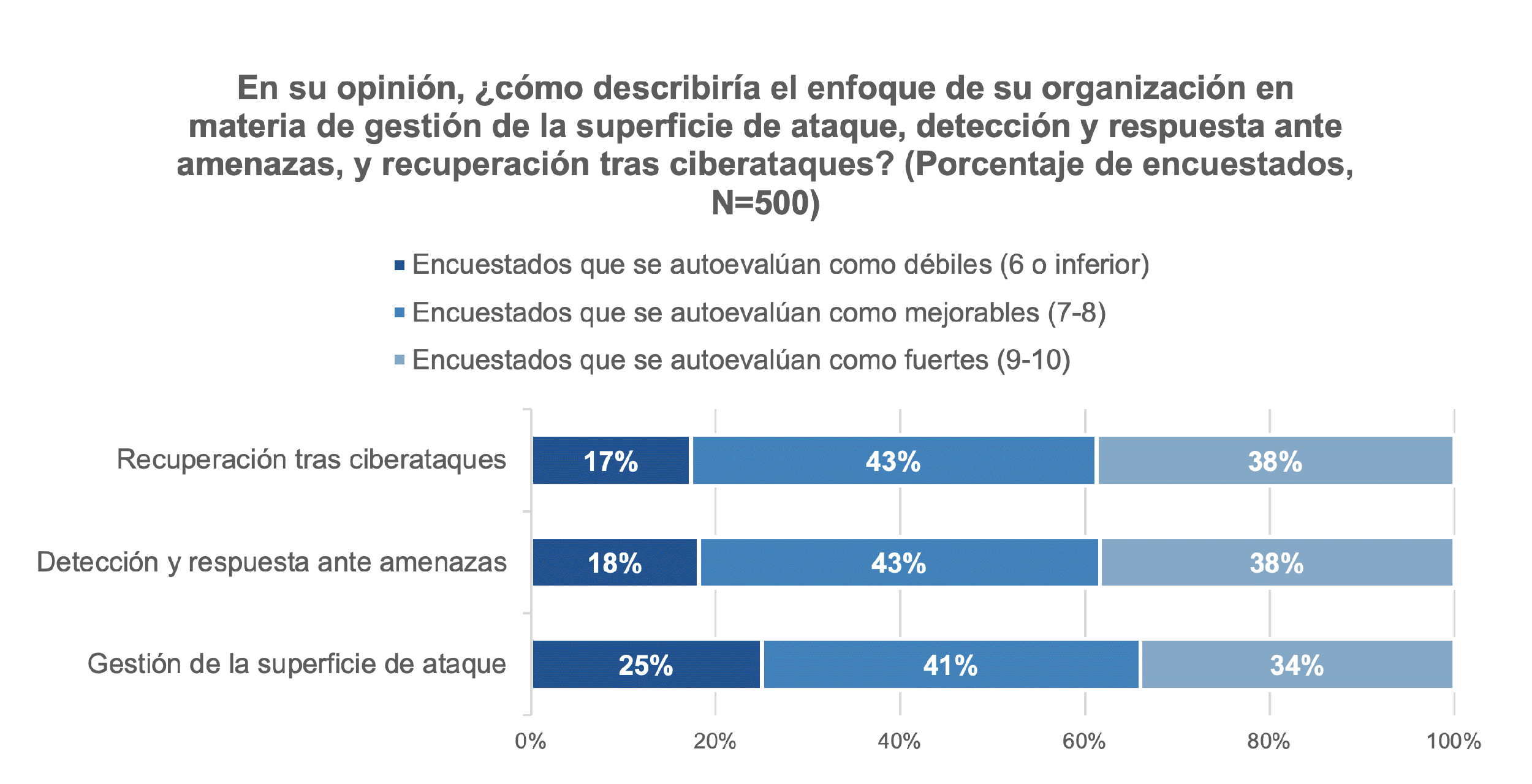 Cuando se pidió a los encuestados que calificaran sus capacidades del 1 (básico) al 10 (vanguardia), el 25% indicó que la gestión de la superficie de ataque en su organización era de 6 o inferior, frente al 18% en el caso de la detección y respuesta ante amenazas y el 17% en el caso de las capacidades de recuperación tras ciberataques.