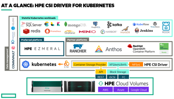 HPE, a leader in IT infrastructure, offers a powerful, versatile platform that not only supports the needs of enterprise container workloads, but also does so in a manner that allows development teams to maximize the value of containers and Kubernetes to the whole company. Playing a key role in delivering these benefits, HPE’s Container Storage Interface (CSI) technology simplifies and optimizes container integration for persistent storage across modern, hybrid, and multi-cloud infrastructure environments.