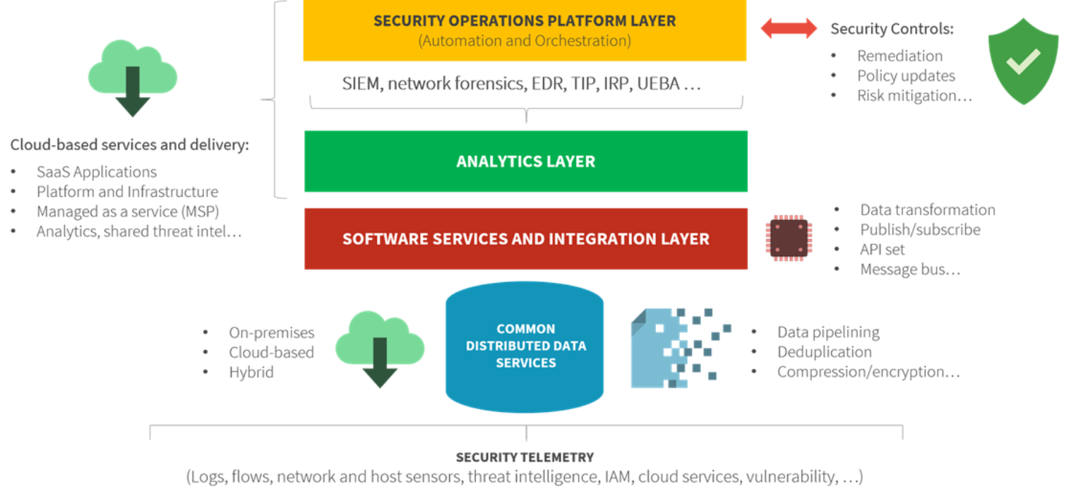 Software services and integration layer. This layer serves as a bridge between security data and analytics engines that consume the data. The software services and integration layer makes all security data available to analytics engines when they want it and in the format they want it.