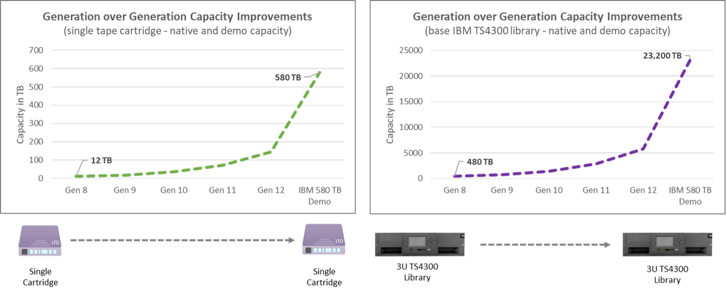 In a recent ESG research survey, ESG asked participants what benefits they realized from using tape technology. The two most common benefits identified were proven reliability (46%) and proven security (44%) (see Figure 1).1 These benefits represent some of the core values of tape as a part of any data lifecycle management program. Tape has always been viewed as a reliable solution since its creation in 1952, when one reel could hold about 2MB of data, up to today with a single cartridge capacity of 20.0 TB. The ability to isolate tapes offline delivers a strong security component of cyber resiliency when implemented properly. Total cost of ownership, better storage efficiency, and better media longevity when compared with alternatives all ranked very high with ESG research respondents as business benefits of using tape as a data protection and retention technology. The long-term value is extremely high, as the cost for management is low and life expectancy exceedingly long. Tape has been on a steady path of increasing capacity and continues to promise dramatic future capacity increases with the recent announcement by IBM and Fujifilm. Now, the two firms together have demonstrated their ability to meet or exceed capacity roadmaps with their groundbreaking 580TB technology.