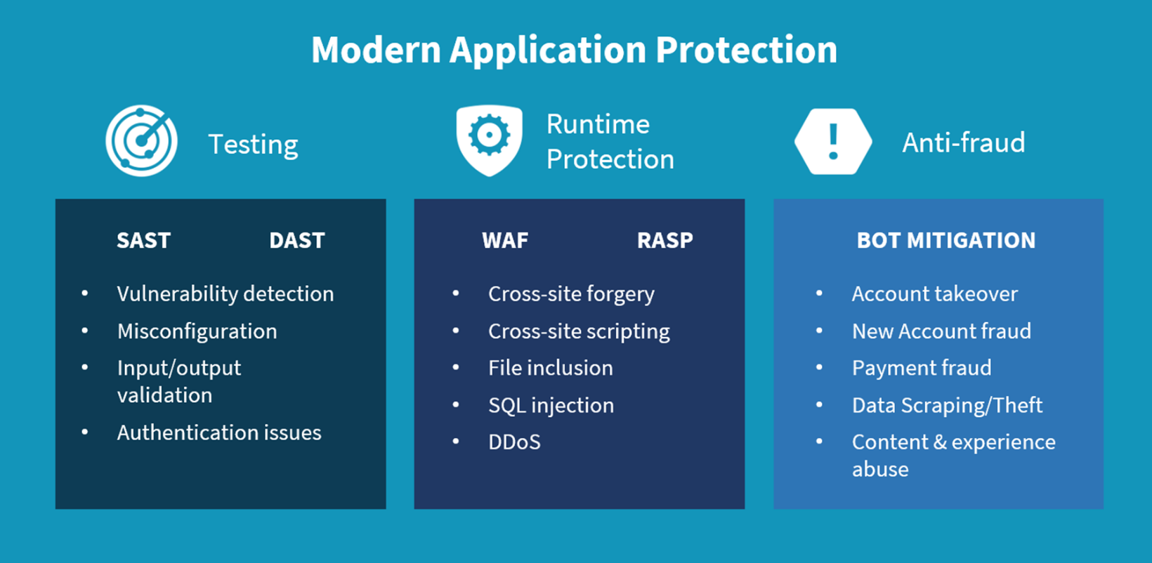 While awareness of the threat posed by sophisticated bots is growing, existing security tools do not adequately address the issue. Historically, simple bots were focused on web scraping or in some cases would launch a high volume of fraudulent login attempts or account-based attacks. These attacks were basic and straightforward to detect and mitigate via traditional application security tools or manual intervention because of the noticeable volume or source IP addresses used. However, as bots have grown more sophisticated, these defenses have become less effective. Application security has historically included both testing and runtime protection solutions. Testing includes both static and dynamic application security testing (SAST and DAST), while runtime protection includes web application firewalls (WAFs) and runtime application self-protection (RASP). Testing solutions scan the code or production application itself to discover potentially exploitable vulnerabilities, misconfigurations, or authentication issues. Because bots exploit legitimate application operations as opposed to vulnerabilities or misconfigurations, these solutions do not address bot-based threats.