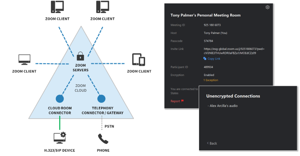 Zoom offers methods for a range of third-party services and devices to connect with their system, leveraging communication protocols native to the specific third-party device or server. Encryption methods are limited to what’s possible on each device. In this case, customer data transmitted via these devices and services may not be encrypted in transit to and from Zoom’s cloud connectors. For example, if a user calls into a meeting over a telephone (Figure 3), then their audio would not be encrypted until that data reaches Zoom’s telephony gateway. Audio is encrypted at that point and is only decrypted once it reaches the destination clients. All other meeting data would be passed by the Zoom client and would still be encrypted end to end. Link level encryption for third-party H.323/SIP devices is supported and can be enforced as a mandatory control if the device has appropriate TLS 1.2 and AES encryption support.
