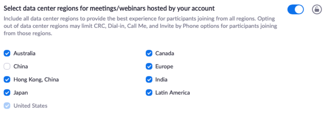 Customers on paid accounts can customize their data center settings with respect to data in transit for Zoom meetings and Zoom video webinars at the account, group, or user level. Organizations can opt in to, or out of, specific data center regions with respect to meeting and/or webinar data in transit (Figure 4). If someone needs to join a meeting from an opted-out region they can, but the meeting data will still not pass through the opted-out data center.