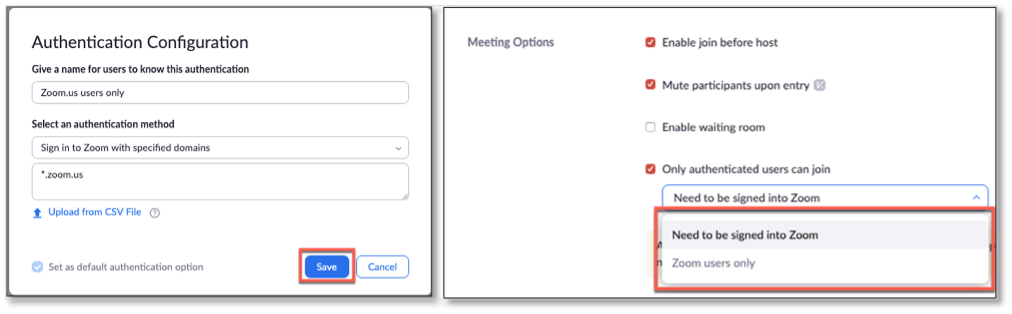 The meeting host can selectively invite participants via email, instant message (IM), or text message (SMS), which provides greater control over the distribution of meeting access information. The host can also allow members from a certain domain to join a meeting and/or wait in a meeting’s waiting room. Meeting hosts can also customize the registration page with a banner and logo. By default, Zoom restricts participants to just those who are logged into Zoom (see Figure 6). Any of these features can be selectively locked by the administrator.