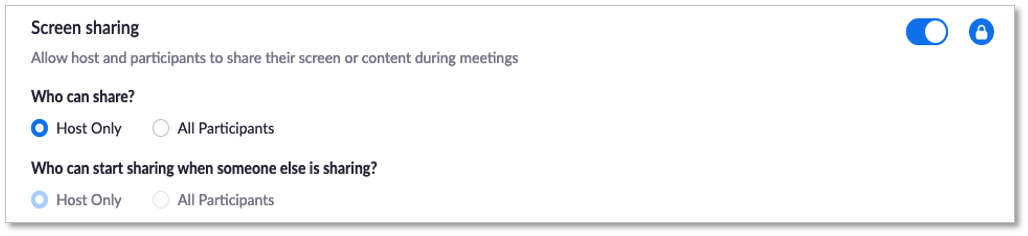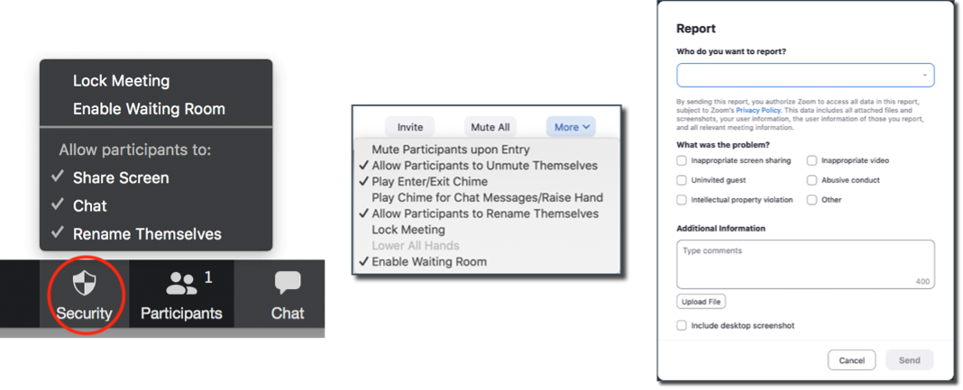 For an added layer of security, Zoom allows the meeting host to disable a participant’s ability to unmute themselves. When the meeting host is ready to make the meeting interactive, they can simply hit the “Unmute All” button or allow participants to unmute themselves, which asks participants for unmute consent. The ease of screen sharing is one of Zoom’s advantages, but that can also leave the meeting open to unwanted disruptions. Zoom gives the meeting host the ability to restrict screen sharing to only the meeting host or limit users’ ability to start sharing if someone else is presenting. The meeting host can easily toggle these features on and off from the screen sharing menu, as well as the security menu (see Figure 7).